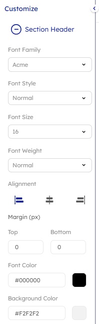 Please Note: Whenever a new section is added, users will be redirected to this section, and will not be required to manually navigate around. Users will always be able to return to previous sections by scrolling up (when many sections are present).Section Header: Users can customize section header appearance by modifying: 1. Font Family, 2. Font Style, 3. Font Size, 4. Font Weight, 5. Alignment, 6. Margin (px), 7. Font Color, 8. Background Color.