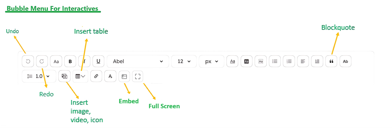 The Section body of the bubble menu for Interactives includes four additional features not available in the bubble menu for the editor, as mentioned below.