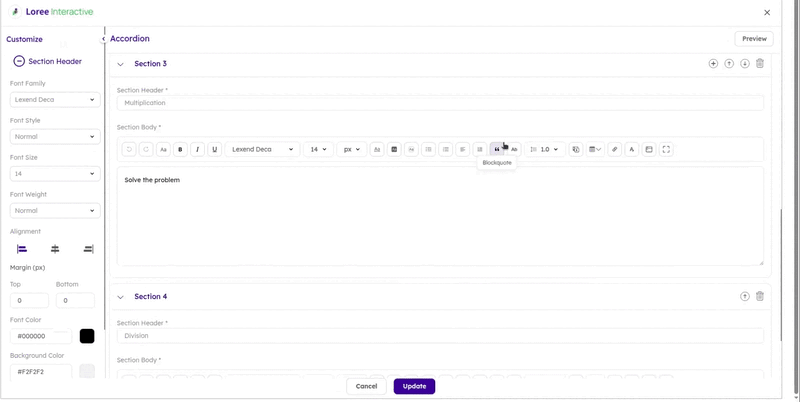 Expanded Editor Space in Loree Interactive We’ve introduced an enhancement to the editor space in Loree Interactive, giving you more room to view and work with larger content. The editor can now be expanded up to 800px, allowing for a clearer and more comfortable workspace. You can adjust the size by dragging the expand arrow, and if you want even more space, you can switch to full-screen mode from the bubble menu. Previously, the editor space had limited capacity, which made it challenging to view or manage larger pieces of content. With this update, the expansion limit has been increased, enabling you to seamlessly enter, edit, and view larger content directly in the editor. |
