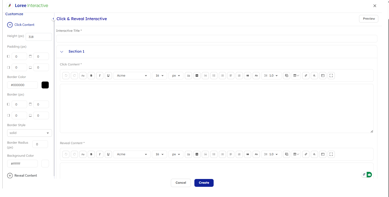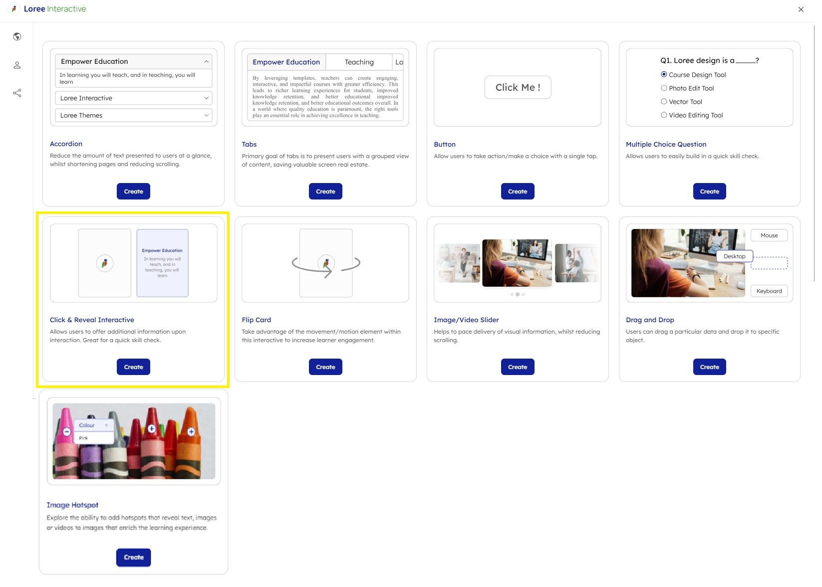 - To create a Click & Reveal Interactive, start by clicking the Create button in the Click & Reveal Interactive section. You will then be redirected to the setup page, where you can begin building your interactive content.