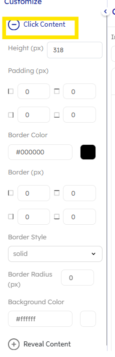 Mirrors the Click section and includes options for Height, Padding (px), Border color, Border size (px), Border style, Border radius, and Background color. |