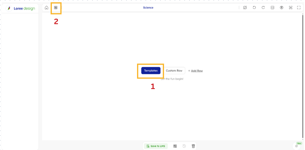 - Click the Template icon in the top navigation bar of the Loree editor. (Refer to the screenshot below, marked as Number 2)