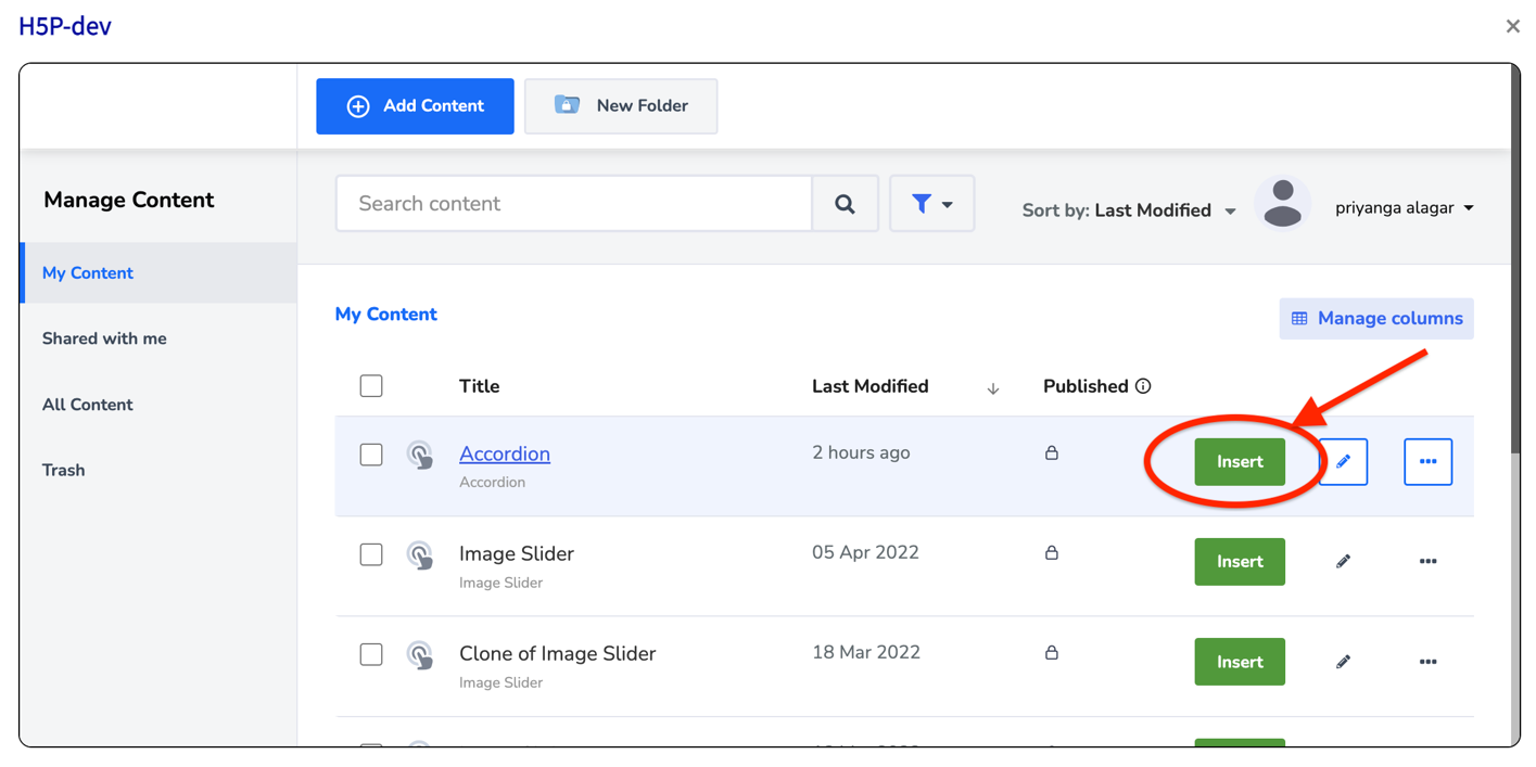 Step 3: After successful launch, you can insert H5P content inside the Loree editor by clicking on “Insert.”