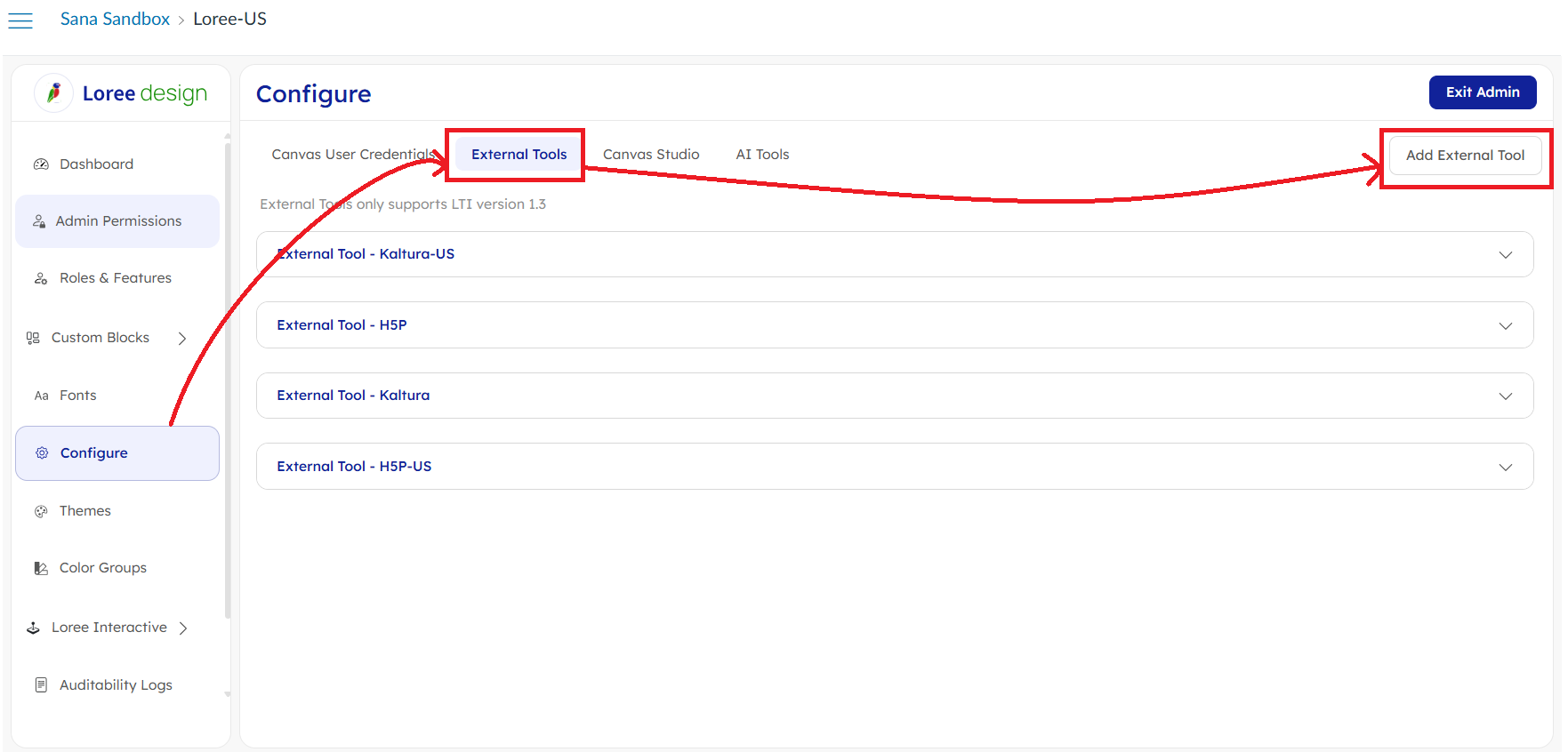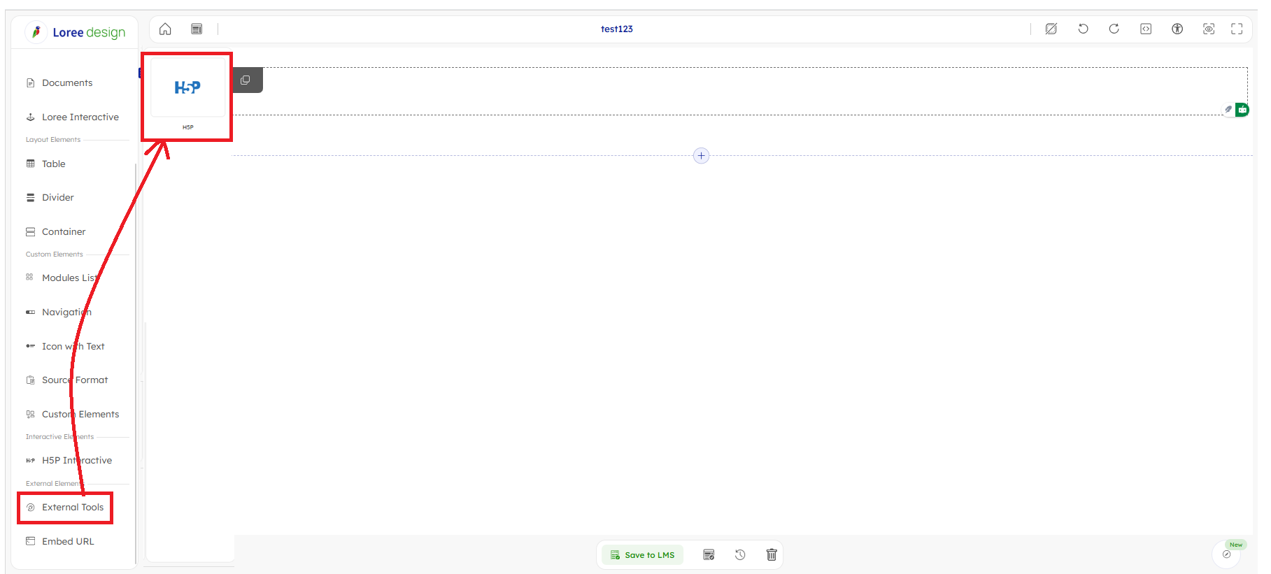 Step 2: Click on “External Tools,” then select “H5P” to launch the H5P in the Loree editor.