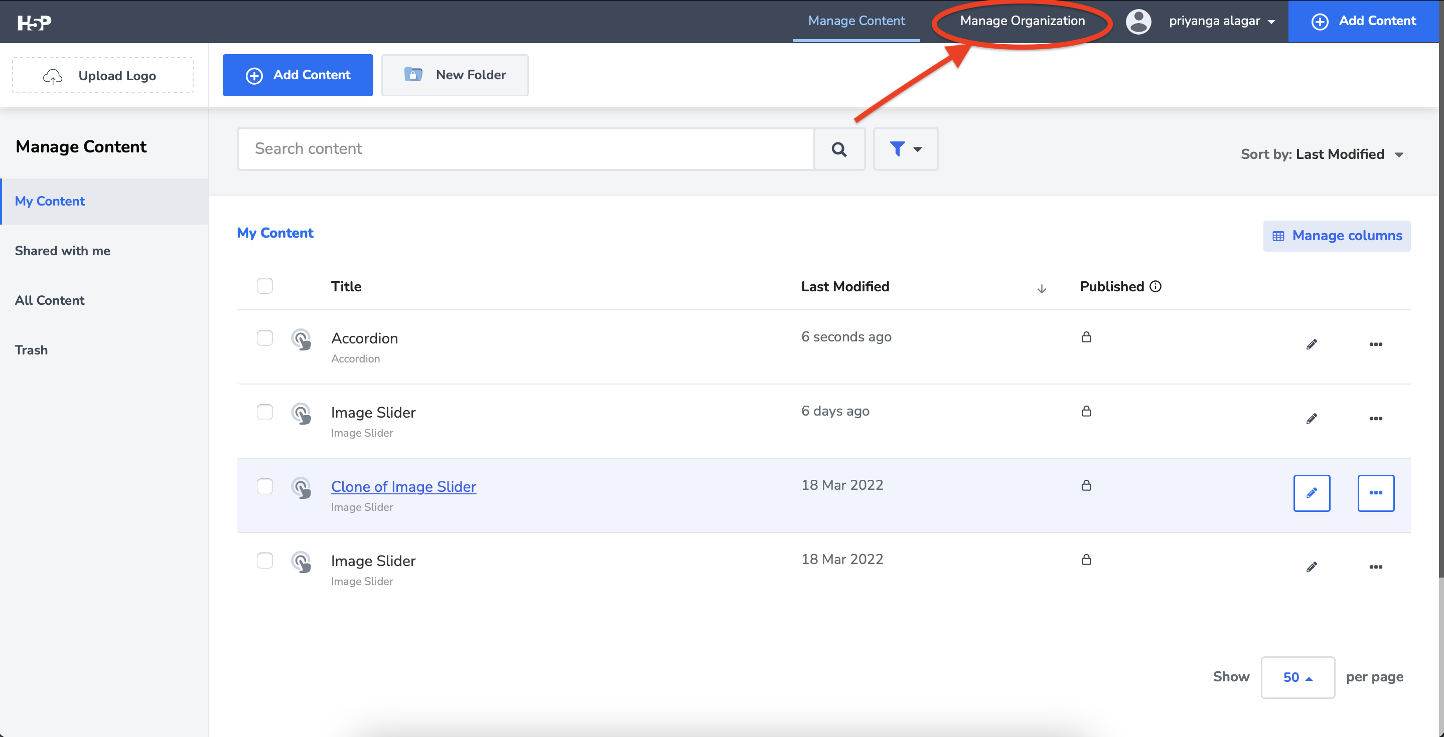 Step 2: Go to “Manage Organization.” Refer to the screenshot below:
