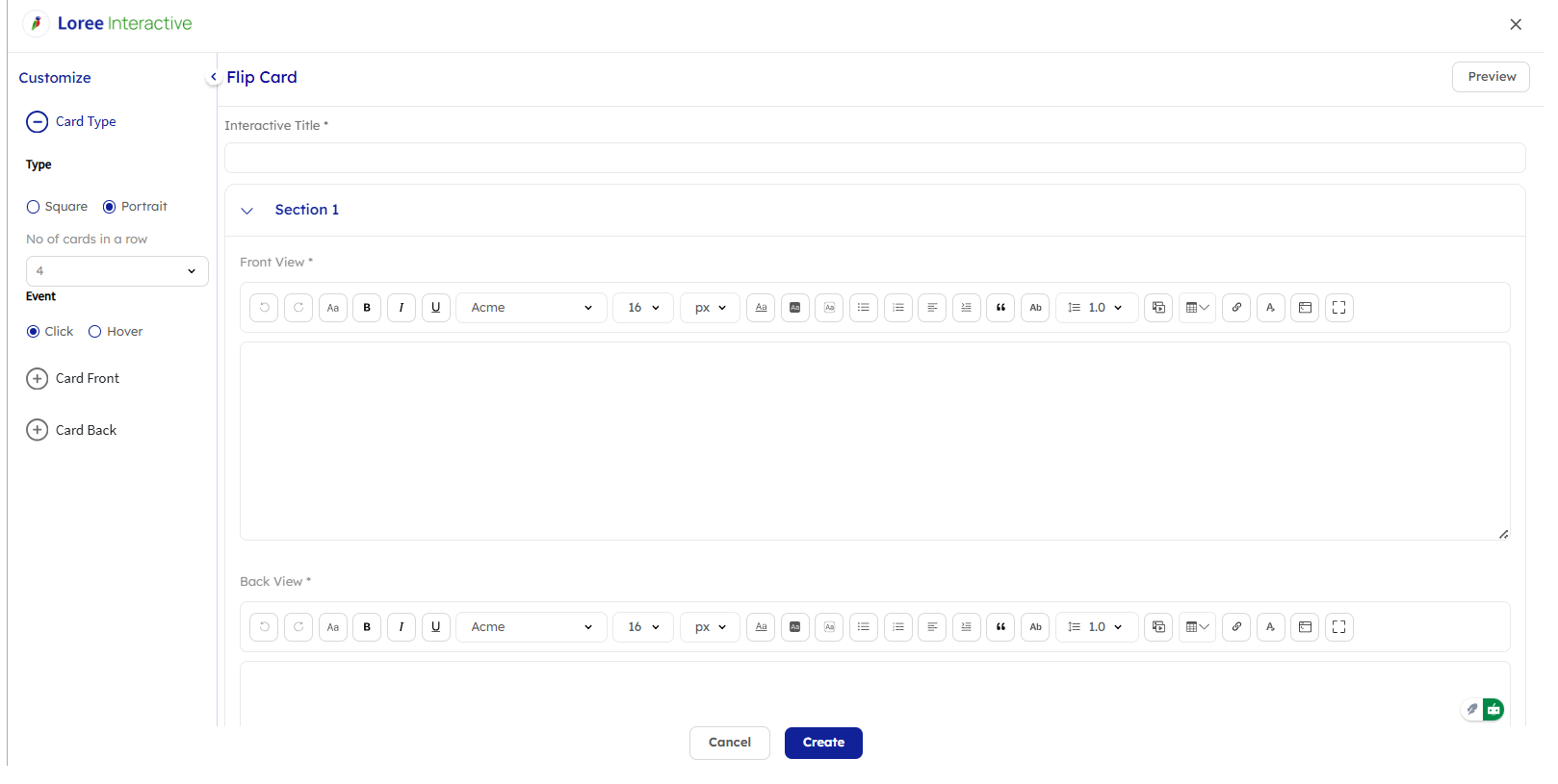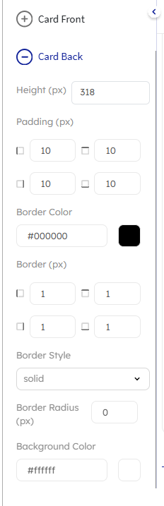 Card Back Enhance the card back in flip cards to provide detailed information or additional content, enriching user interaction and understanding. It mirrors the Card Front customization options. |