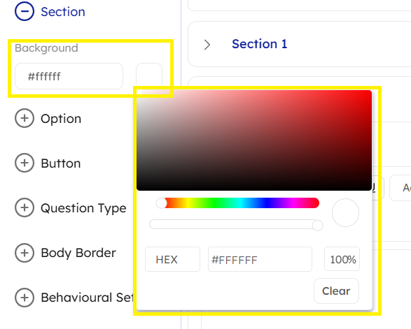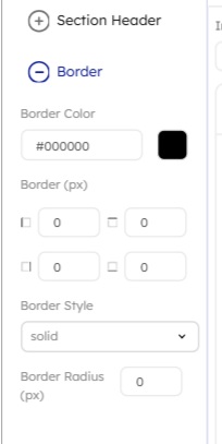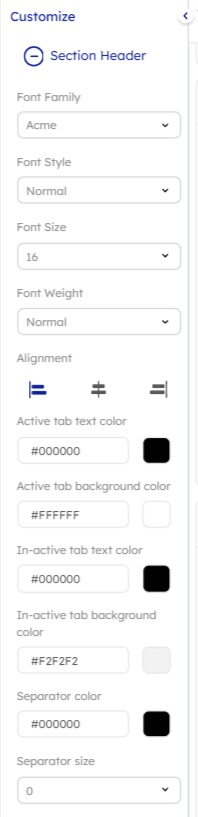 Please Note: Whenever a new section is added, users will be redirected to this section, and will not be required to manually navigate around. Users will always be able to return to previous sections by scrolling up (when many sections are present).Section Header: Users can customize section header appearance by modifying: 1. Font Family, 2. Font Style, 3. Font Size, 4. Font Weight, 5. Alignment, 6. Margin (px), 7. Font Color, 8. Background Color.