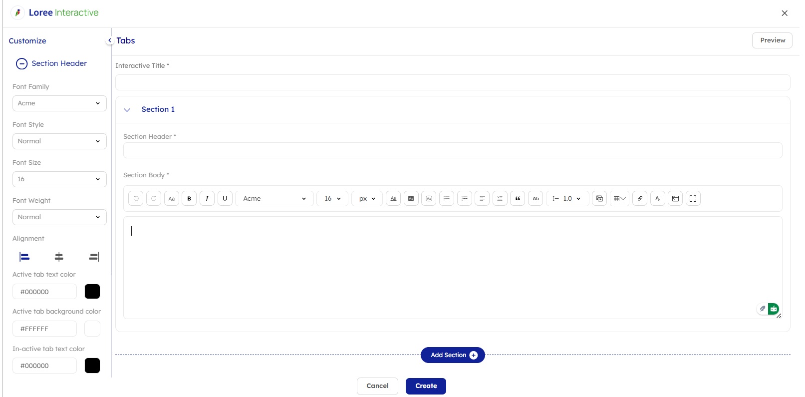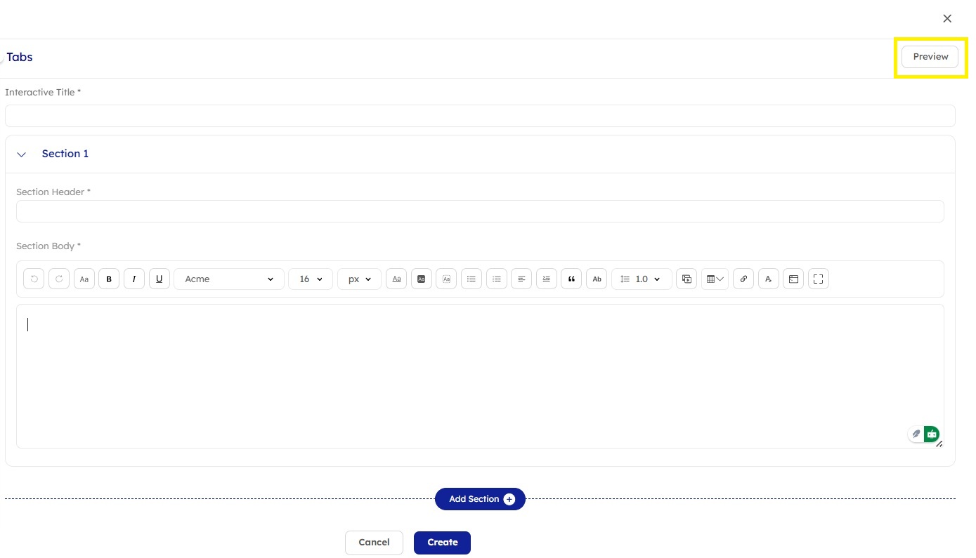 Once the form is open, you'll find the following fields to fill out: Interactive Title: Input a title or name for the Tabs interactive. Section Header: Enter a title for each section, which can be expanded or collapsed by users. Section Body: Input content to be displayed when the section is expanded. |