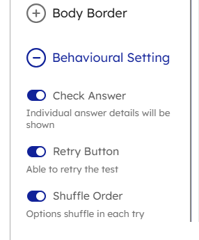 | | Behavioural Setting: Behavioural settings control how learners interact with questions and how feedback is delivered. These options help you shape the quiz experience to support learning, engagement, and fairness.