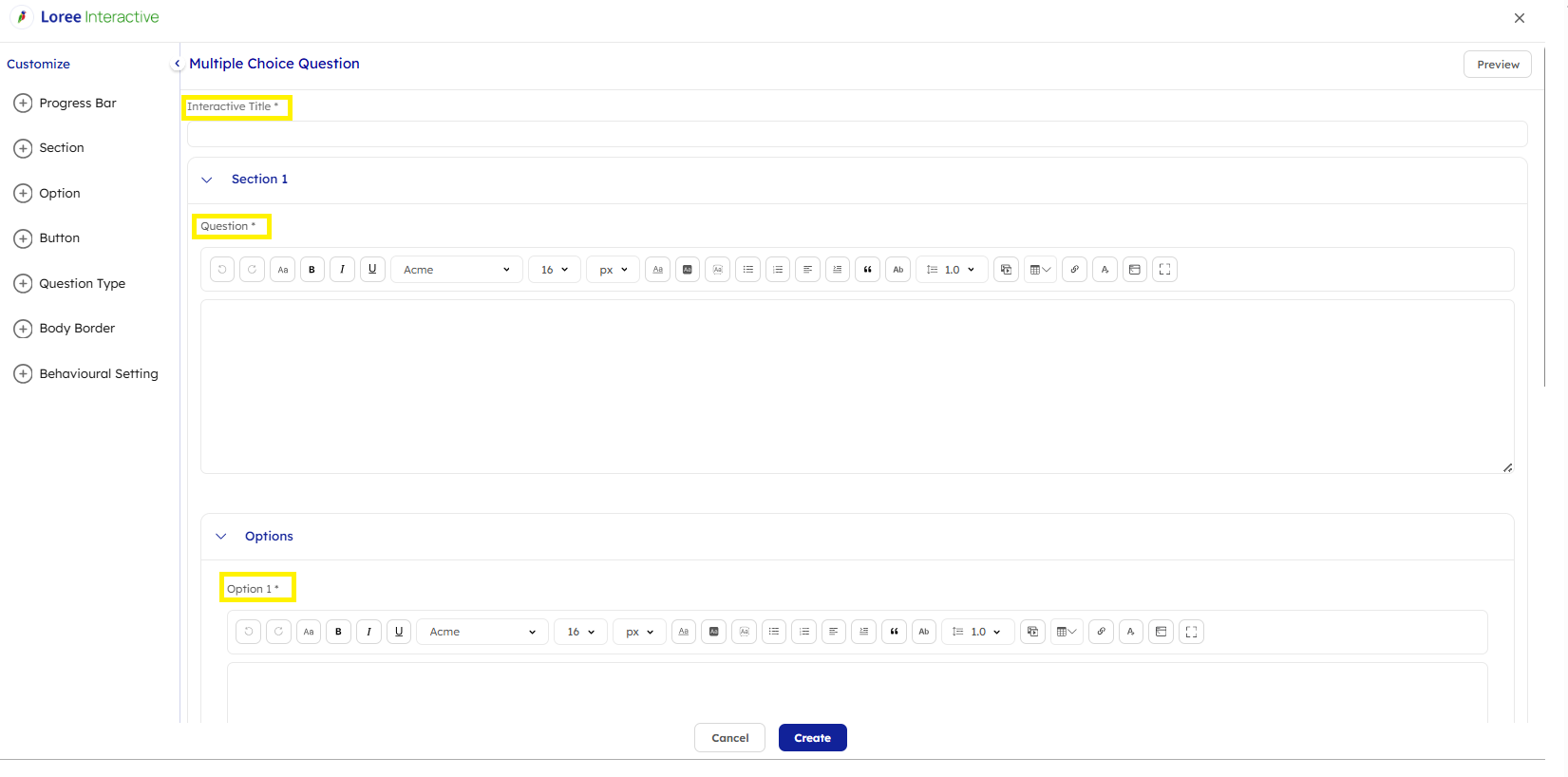 Customization settings allow you to tailor the look and feel of your MCQ interactive so it aligns with your branding and design preferences. These options help you adjust fonts, colors, styles, spacing, and other visual elements to create a polished and engaging learner experience.