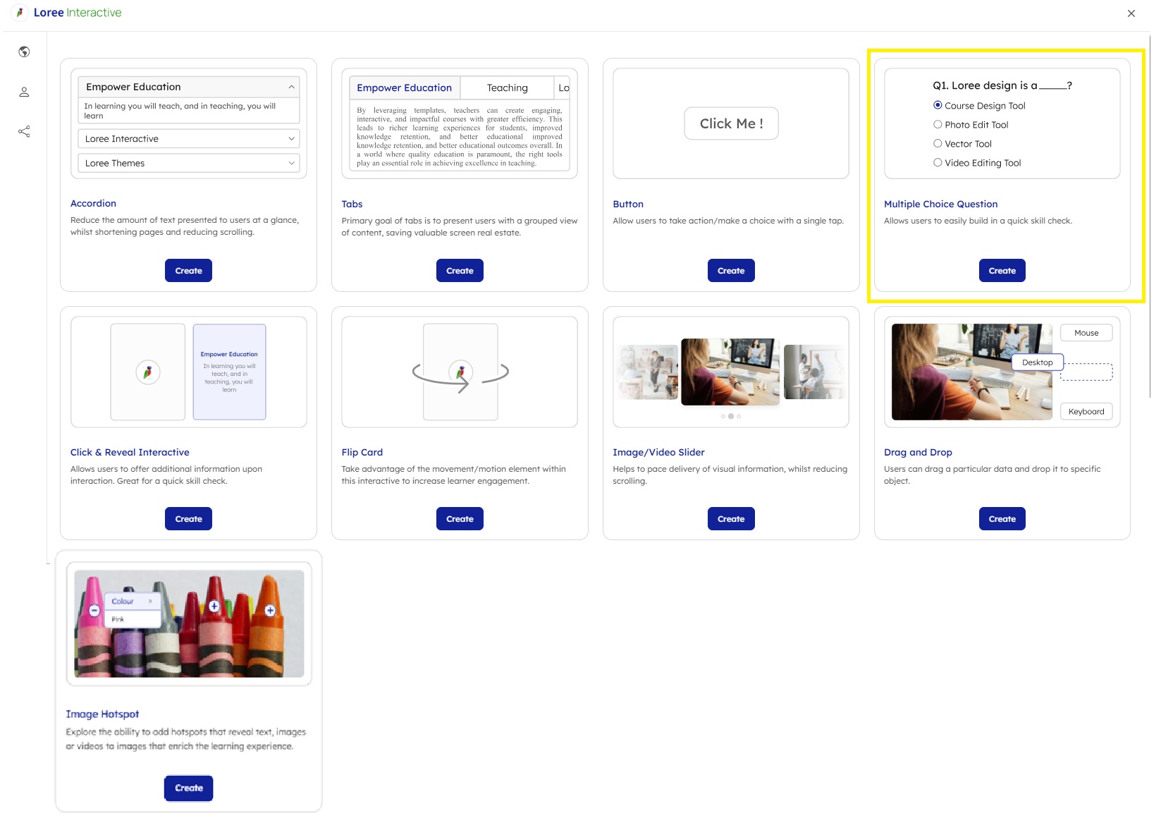 These options offer flexibility when designing quizzes, assessments, or surveys, helping you match the interaction style to the needs of your content. |