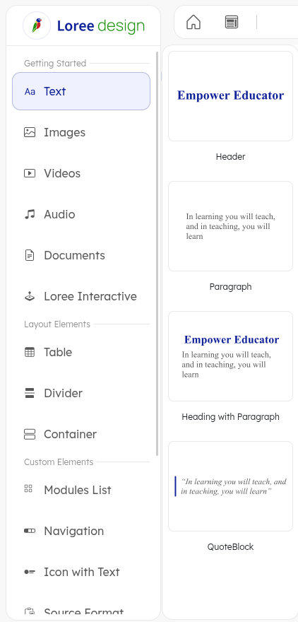 Now Loree brings you three different QuoteBlock presets that users can access by clicking the style of QuoteBlock element from the Text element; that opens up a sub-element preset tray having the following QuoteBlock styles: