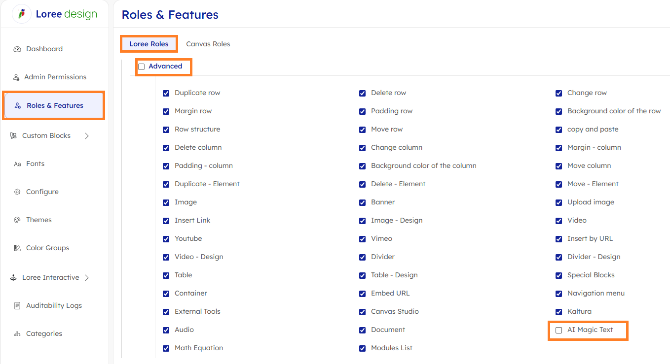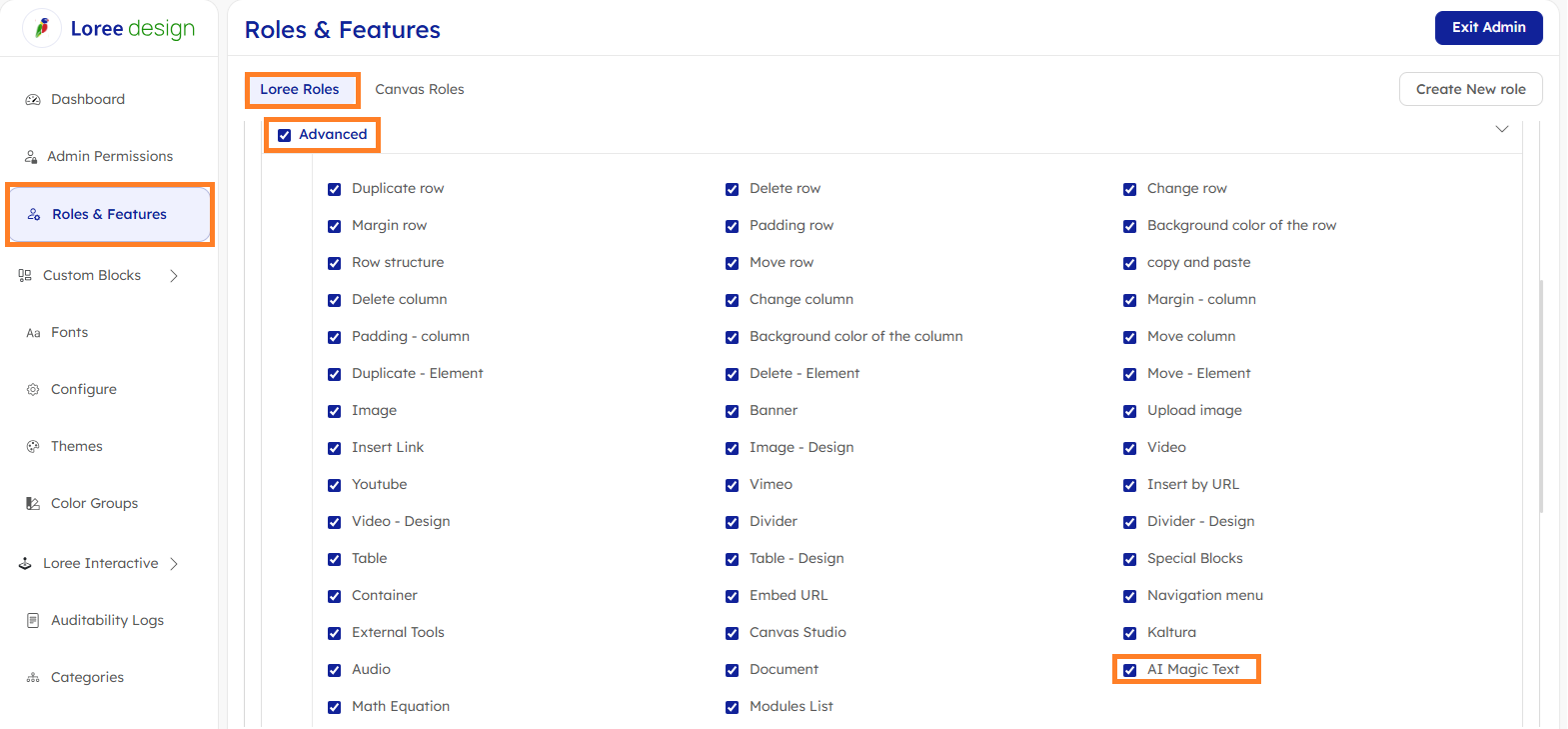 After successfully adding the API key, the next step would be to click on the Roles & Features option in the dashboard and activate the toggle on/off option from the Advanced tab for your AI Magic Text Editor tool, as shown below: