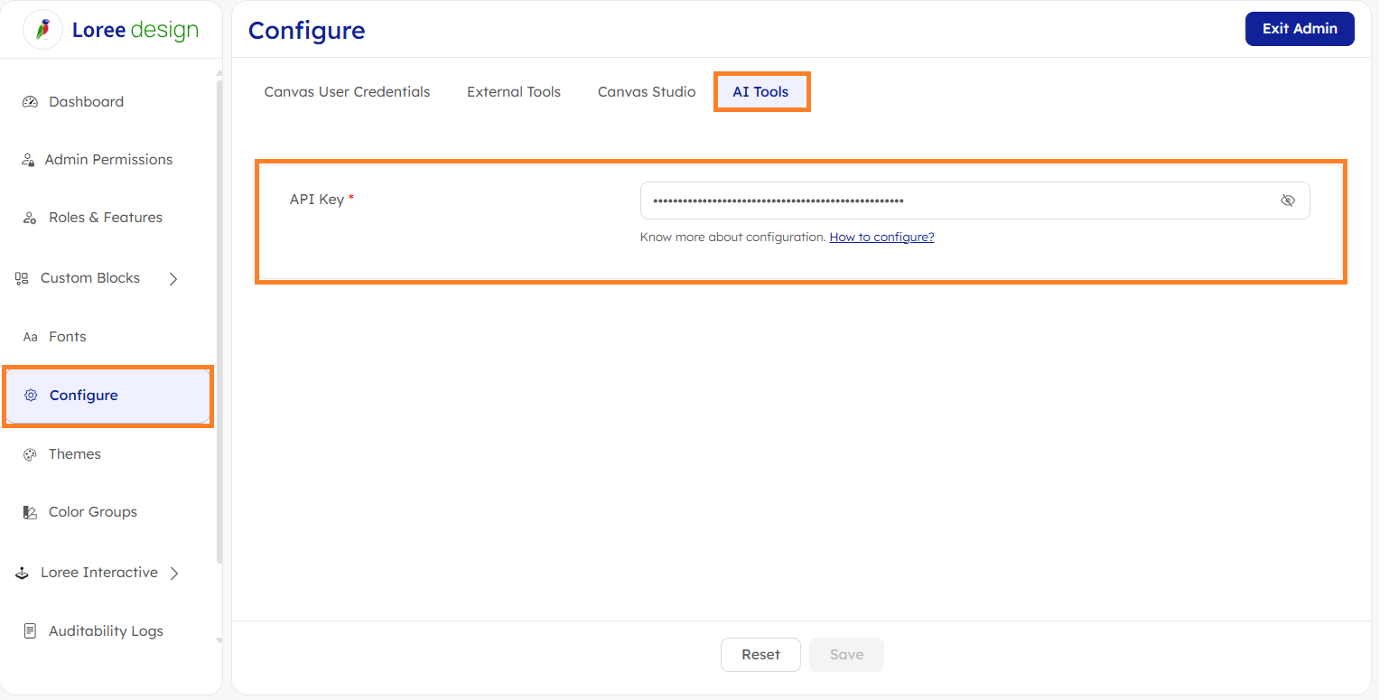 Admins can access the AI tools in Loree by making a simple visit to the Admin Dashboard and selecting the Configure option, then selecting the below-highlighted AI Tools option and entering a valid API Key, which can then be safely added to the configuration by clicking on the Save button that will get highlighted in dark blue once a valid API Key is inserted, as shown in the image below: