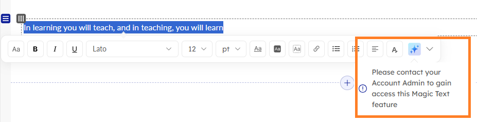 If the toggle option is turned off as shown below in the 1st image, then the AI Magic Text option will be disabled for the user in the bubble menu as shown in the 2nd image: