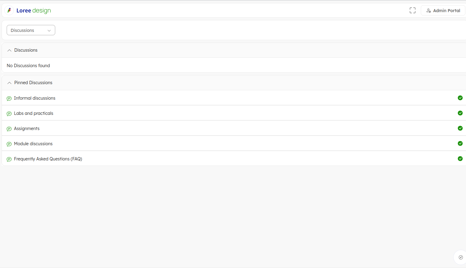 The discussions list in Loree is structured similarly to Canvas, with features like Pinned Discussions and Discussions group, providing a familiar and user-friendly experience.