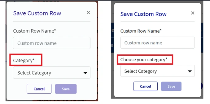 We have updated the Create/Update or Row/Element modal. Previously when we save a custom row the name of the select category option reflects as Category* now it is updated as Choose your category*.