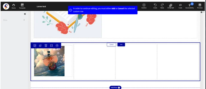 As a Loree user, After adding a Custom Row, the “Add” and “Cancel” button doesn’t appear. So, user is unable to proceed further. This occurs only in the random scenario.