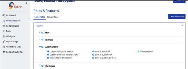 We have added a new feature option Add categories in the checkbox under custom Blockstag. Each existing roles and new roles have this new toggle feature and the default state of the checkbox will be ON as similar to other features. If the “Add categories” checkbox is enabled the “Add new category” option will be enabled on the save template/update template, save row/update row, and save element/update element. If the “Add categories” checkbox is disabled the “Add new category” option will be disabled on save template/update template, save row/update row, and save element/update element.