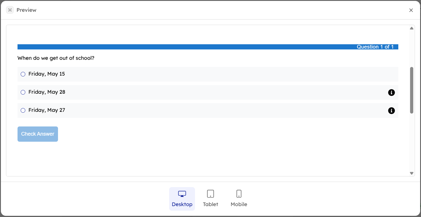 three pre-set screen sizes to choose from: Desktop, Tablet, and Mobile.