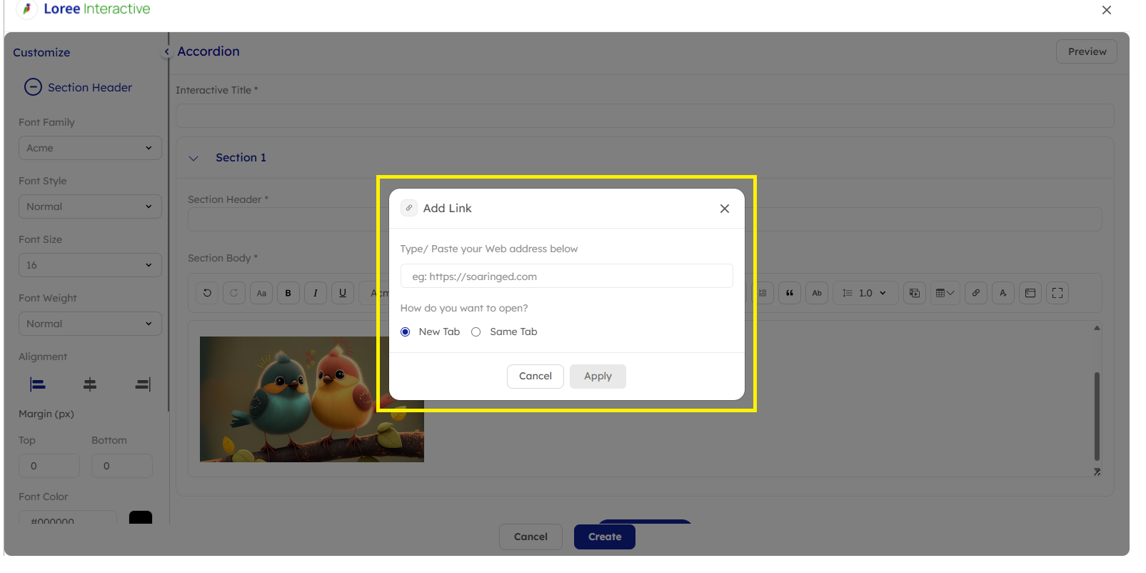 In our previous release A2503.2, the Add Link option was only available for the Button interactive. With this update, the enhanced Link Modal is now available across all Interactives that include the Editor, giving you a consistent and powerful linking experience.